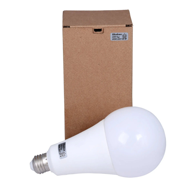 مناسب برای انواع گیاهان آپارتمانی و گلخانه ای ، 20 وات ، فول اسپکتروم یعنی شامل تمامی طیف های نوری مورد نیاز گیاه میباشد ، دارای سرپیچ E27 مانند لامپ های معمولی ، رنگ یاسی ، تولید شده با چیپ ال ای دی با کیفیت ، طیف رنگ 380 تا 800 نانومتر ،دارای بالاترین بازدهی با تضعیف طیف سبز و تقویت طیف رنگ آبی و قرمز زمان استفاده بسته به نوع گیاه که آفتاب دوست یا سایه دوست باشد بین 5 تا 18 ساعت متفاوت است . لامپ رشد گیاه شاهان با توان 20 وات از 20 عدد چیپ ال ای دی smd مختص رشد گیاه ساخته شده است و دارای لیبل کنترل کیفیت QC طلایی میباشد