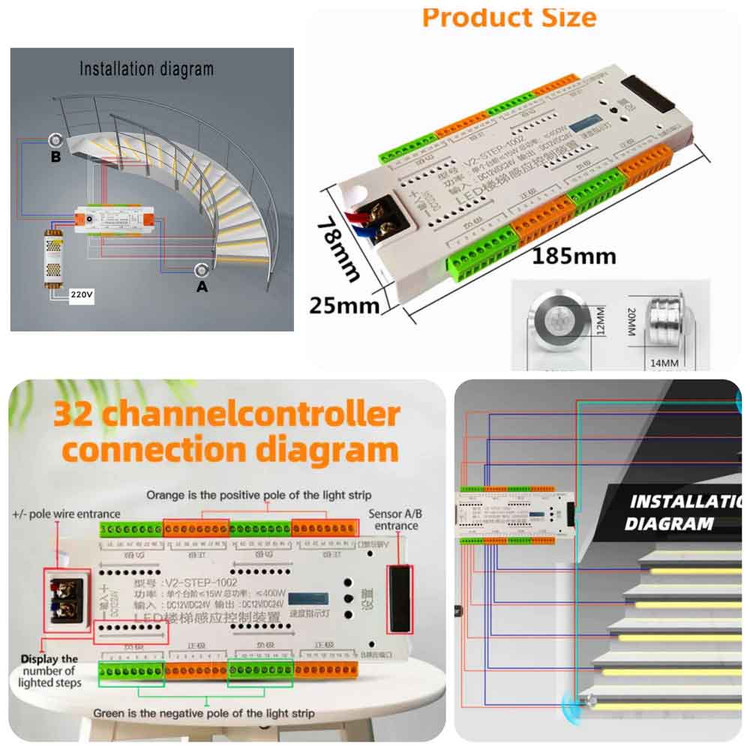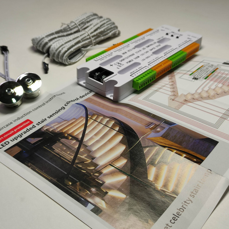 کنترلر راه پله هوشمند ۳۲ کانال از سنسورهای حرکتی برای تشخیص حضور افراد در پلهها استفاده میکند. هنگامی که سنسور حرکتی حرکتی را تشخیص میدهد، چراغها به طور خودکار روشن میشوند و پس از گذشت زمان مشخصی خاموش میشوند.