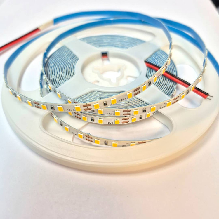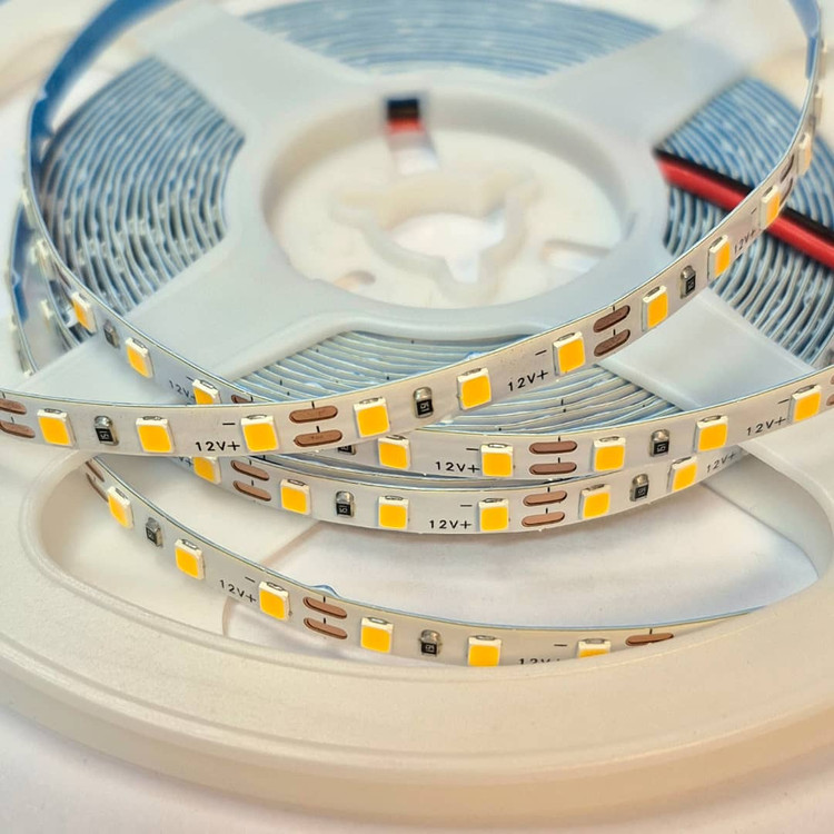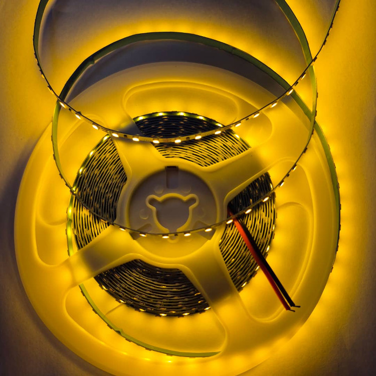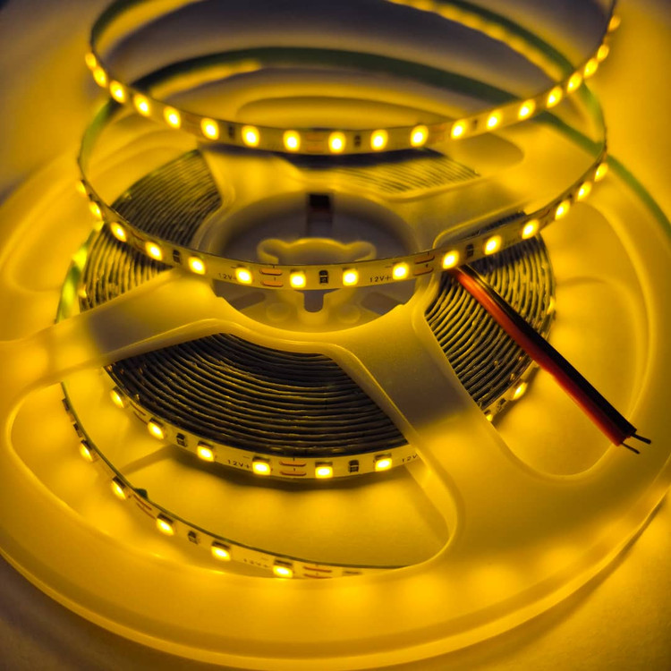 نواری تراکم ۱۲۰ ال ای دی رول ۵ متری ۱۲ ولت رنگ انبه ای طلایی عرض pcb پنج میل پشت چسب دار