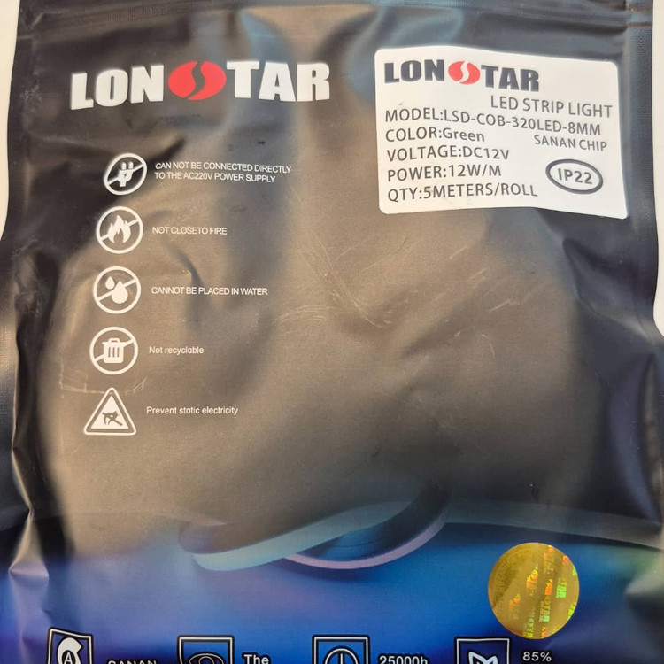 ریسه نواری cob سبز تراکم ۳۲۰ برند لانستار ۱۲ ولت حلقه ۵متری
