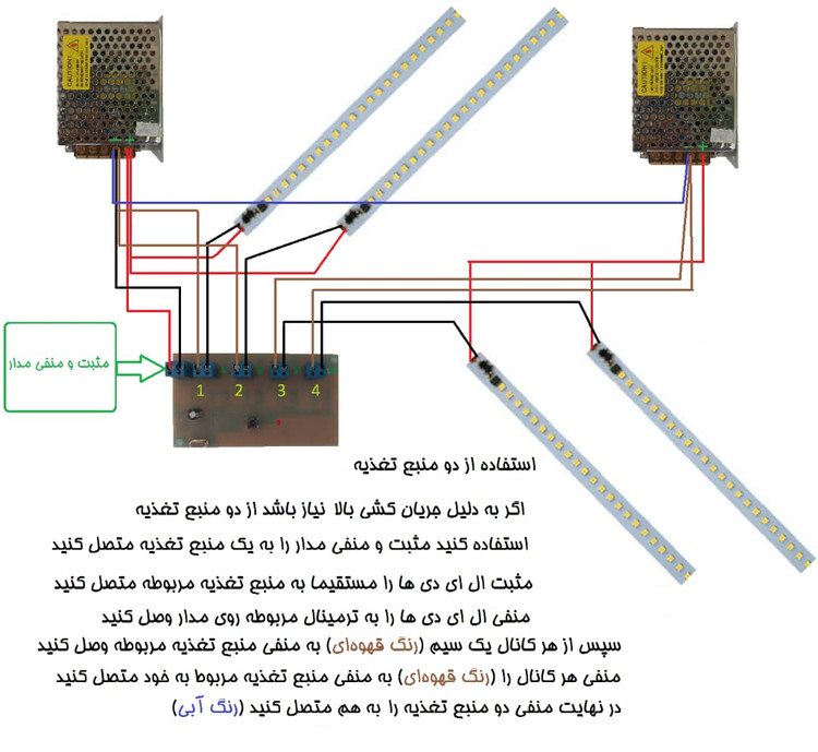 جهت راه اندازی مثبت و منفی از منبع تغذیه به برد وصل میشود و از منبع تغذیه برای هر کانال یک سیم منفی آورده میشه و منفی ال ای دی برای هر کانال باید وصل شود و تمام مثبت های ال ای دی مستقیم به منبع تغذیه وصل میشود.