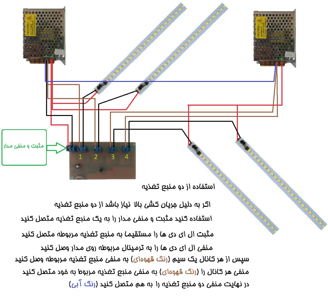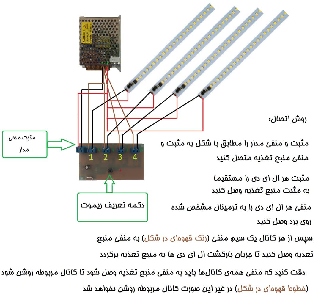 جهت راه اندازی مثبت و منفی از منبع تغذیه به برد وصل میشود و از منبع تغذیه برای هر کانال یک سیم منفی آورده میشه و منفی ال ای دی برای هر کانال باید وصل شود و تمام مثبت های ال ای دی مستقیم به منبع تغذیه وصل میشود.
